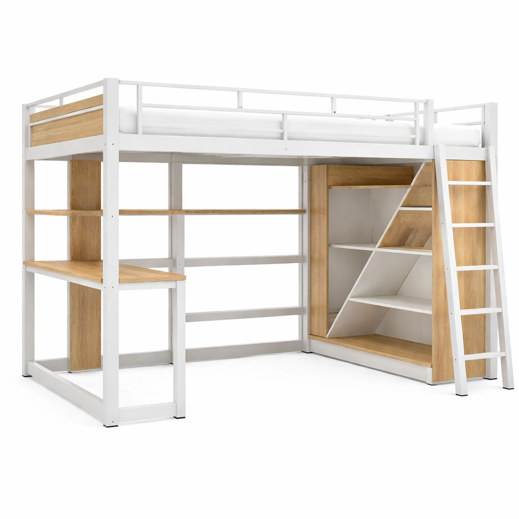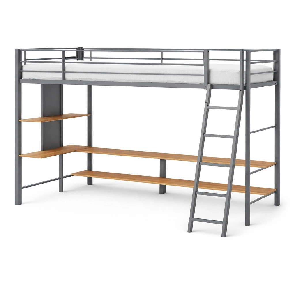 Cama loft de metal con escritorio y estanterías de madera