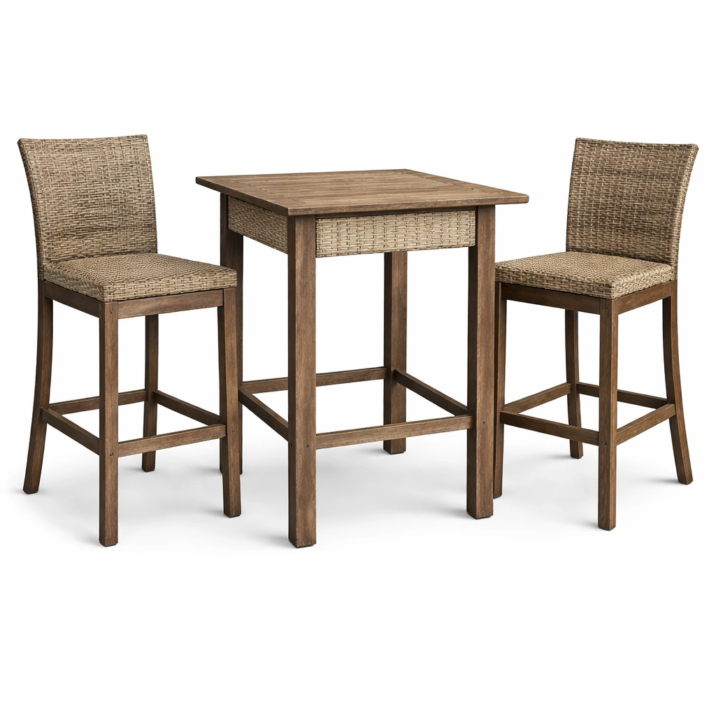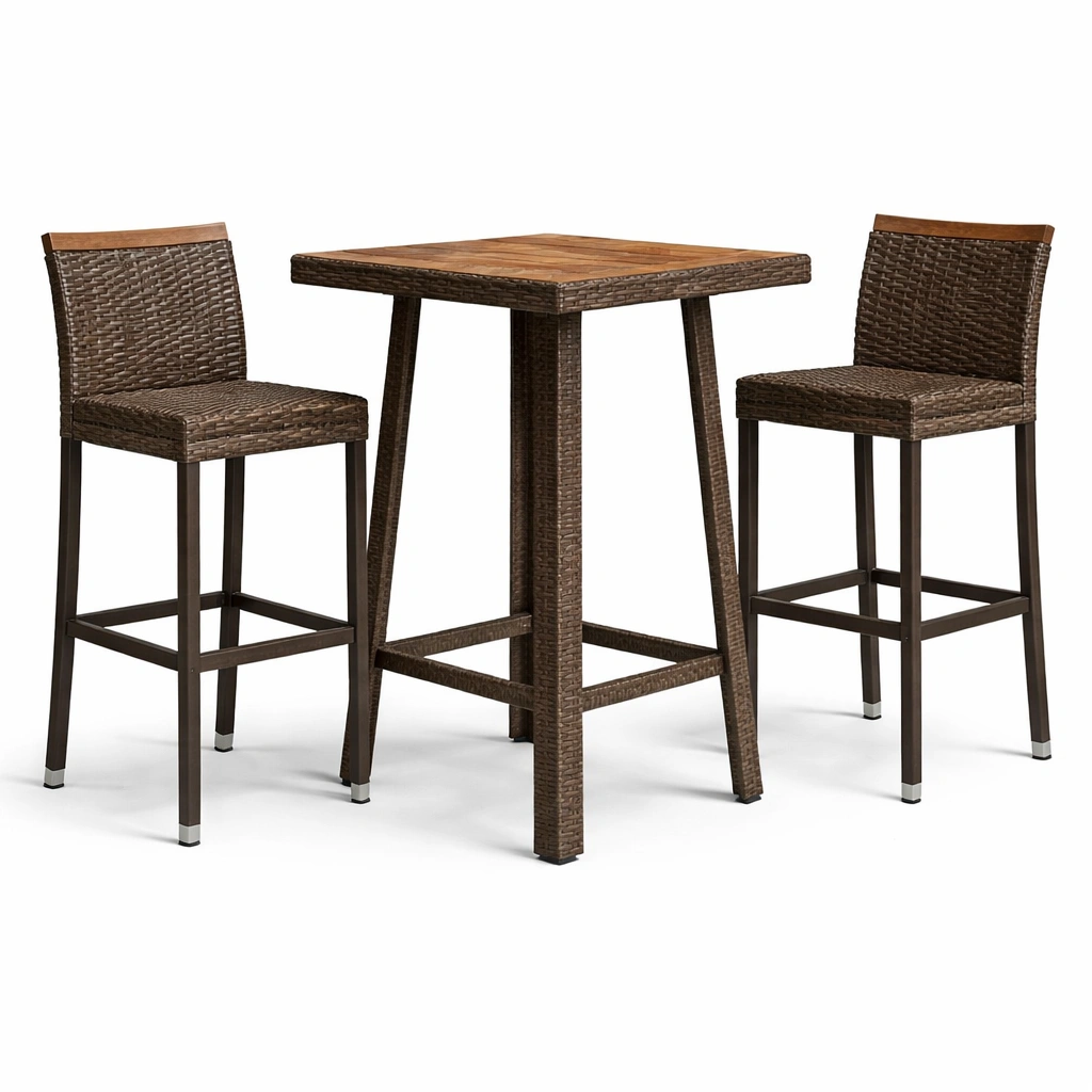 Juego de bar de ratán y acero con madera de teca