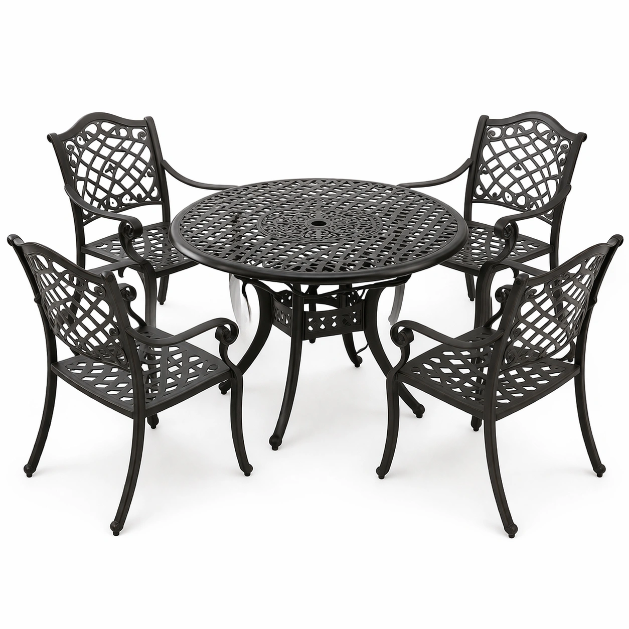 Juego de comedor exterior de aluminio fundido negro con mesa redonda y 4 sillas