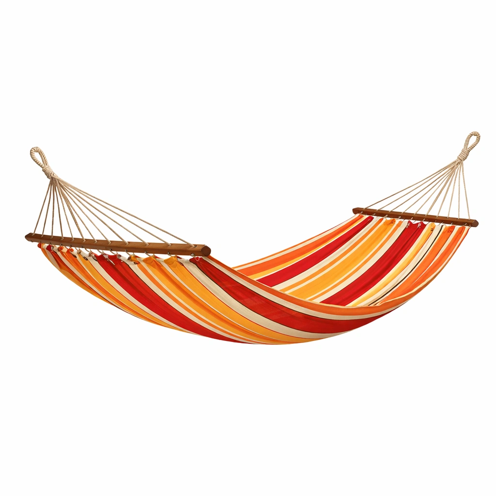 Hamaca de 200 cm hecha de algodón con diseño de rayas en colores rojo, naranja y amarillo. Soporta hasta 120 kg y es adecuada para uso en interiores y exteriores. Incluye cuerdas para montaje. Requiere lavado a mano.