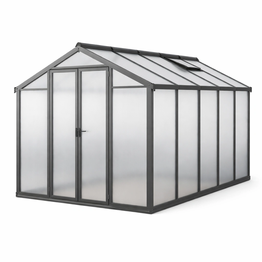Invernadero compuesto por estructura de aluminio y paneles de policarbonato transparente de 4 mm de espesor. Las dimensiones son 250 cm de largo, 190 cm de ancho y 195 cm de altura. Cuenta con una puerta doble y un sistema de ventilación. Diseñado para uso exterior, ofrece resistencia a la intemperie y transmisión de luz.