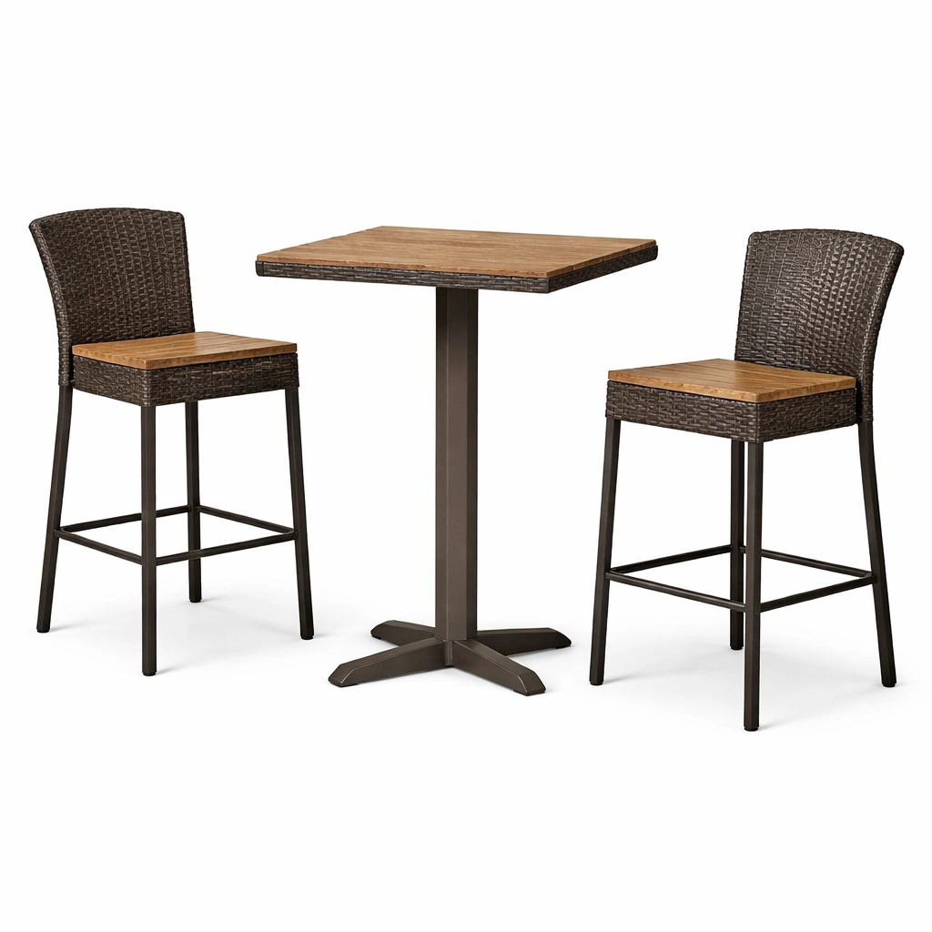 La estructura es de aluminio, mientras que el tablero de la mesa y los asientos están hechos de madera de acacia. Los respaldos están fabricados con ratán sintético. Los colores son Marrón y Negro.